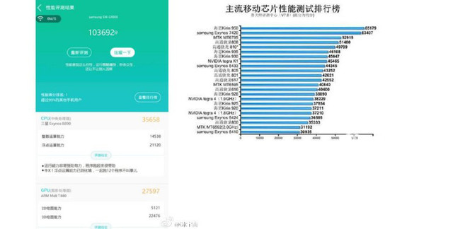 Результати синтетичних тестів просто приголомшують. Якщо до цього світовим рекордом продуктивності був результат у 65 з невеликим тисяч одиниць, то Exynos 8890 Octa Core вперше перевалив стотисячну планку, показавши в AnTuTu феноменальний результат у 103692 одиниці.